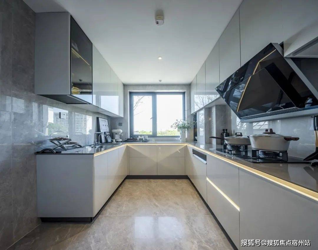 ,尺度之大在600万级产品中非常难得一见。U型厨房带飘窗的设计,左侧预留了