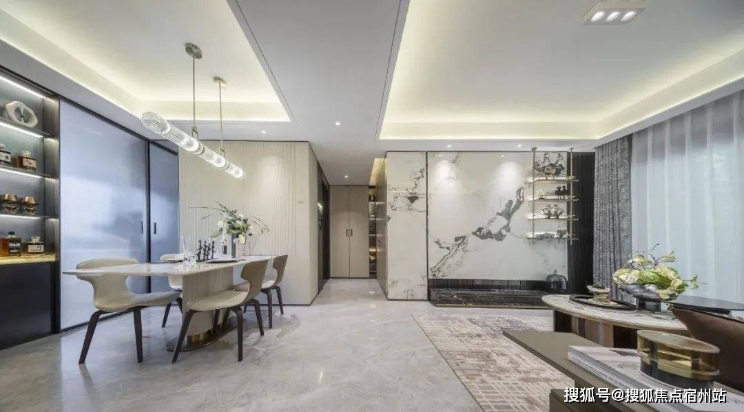 客餐厅一体化,南连同尺度宽景阳台,将生活的奢度打开。金茂定制壁布或墙纸交标结合芬迪白岩板客厅背景墙